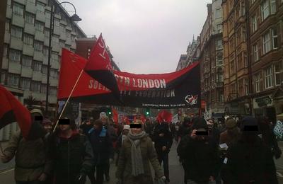 Here in London, after the initial march was completed some of us went to have much-needed pint while others took the opportunity to join a breakaway march to Egyptian embassy to show solidarity with workers and students in struggle in Egypt and across the wider Middle East. For those of us in North London, this was the inaugural appearance of our swanky new banner. It proved to be a hit with it's eye-catching design, drawing like-minded demonstrators from the crowd to chat and march with us. Please see our pictures below and we'll look forward to seeing you on the streets.