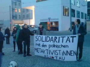 Členovia berlínskej FAU (MAP Nemecko) a ASJ zorganizovali vo štvrtok 24. marca solidárnu akciu s varšavskými nájomníkmi. Protestovali proti bytovej politike mesta, šíreniu strachu zo strany vlastníkov nehnuteľností, ako aj chudoby, ktorá je dôsledkom ich praktík. Počas protestu si ľudia pripomenuli aj zavraždenú aktivistku Jolantu Brzeskú.