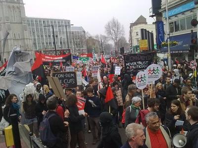 Contra estos ataques, la manifestación del 26 de marzo desbordó todas las previsiones. Desde distintos puntos de Londres, cientos de miles de personas ya se estaban organizando para llegar a la marcha principal, por lo que ya durante varias horas antes hubo un laberinto de distintas manifestaciones. Convergiendo en la orilla del Támesis y el parlamento y de ahí hasta Hyde Park, la marcha principal terminó con los discursos oficiales de los sindicatos corporativos y el partido laborista. Durante la marcha, fueron populares los insultos a los líderes de la coalición en el gobierno: David Cameron y Nick Clegg, al canciller y responsable de los presupuesto, George Osborne, así como múltiples consignas que denunciaban la mentira de la estrategia del gobierno de la ‘gran sociedad’ y los ataques a los recortes servicios sociales, educación, sanidad y, en general, los ataques a la clase trabajadora.